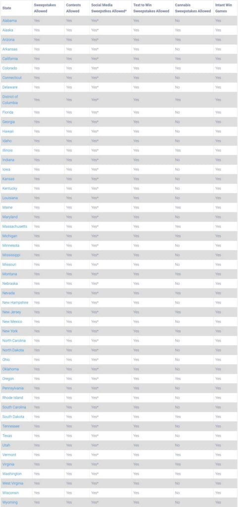 Note: the information above is for informational purposes only and should not be construed as legal advice. Sweepstakes and Contest promotional laws change and the above may not reflect the must current laws.